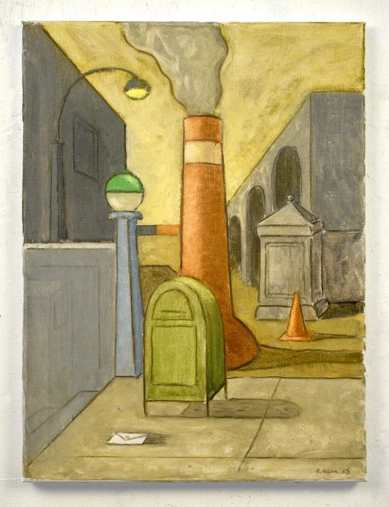 Where Love and Murphy-Torres gesture toward the natural and social worlds, Sutton Allen turns his attention to the built environment—specifically, the overlooked signage and structural forms of city life. Steam pipes, mailboxes, traffic cones, and lampposts are rendered with a quiet monumentality. Through a gradual reduction of space and deepening focus on shape and line, Allen transforms urban ephemera into enduring forms. His paintings chart a path from representation to symbol, asking us to consider how familiar structures might carry new meaning when reorganized in paint.